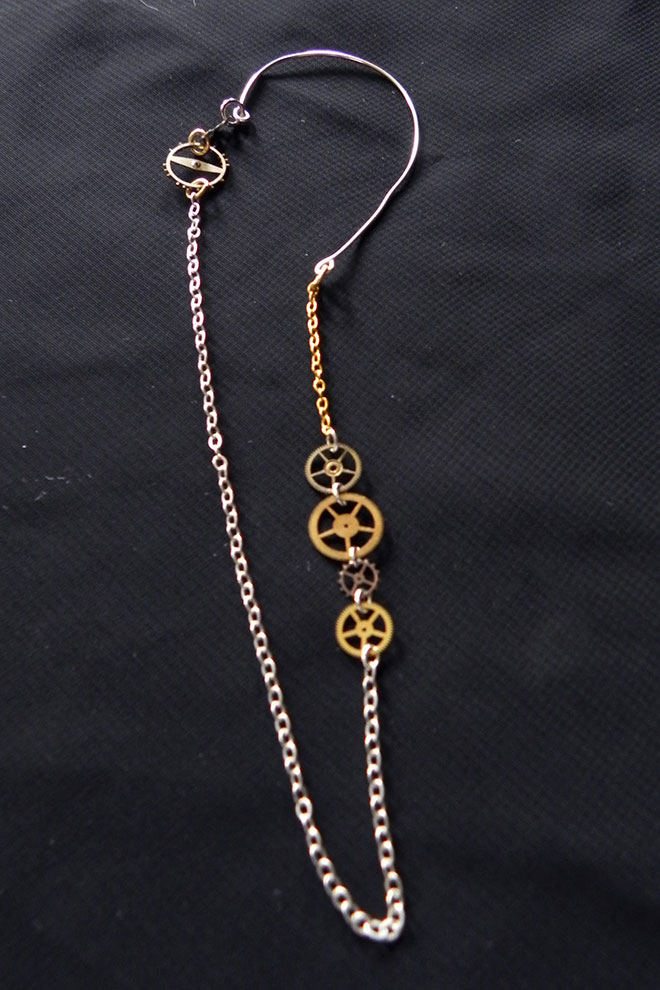Contains: Ear cuff that sits on the curve behind ear. gold plated chain with watch piece accents. one of a kind.